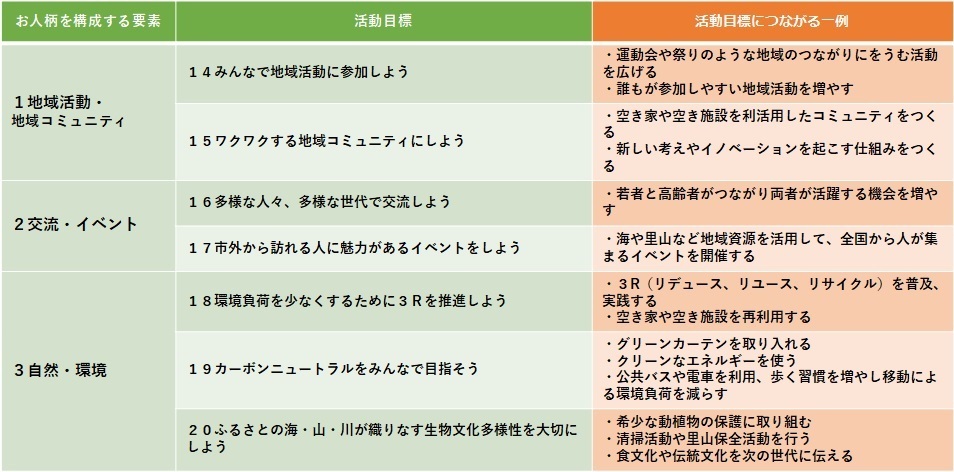 3つのお人柄「極める」「思いやる」「つなぐ」を基本として、持続可能な「暮らしやすさを日本一、実感できるまち」を目指して、地域の守っていきたい、または発展させたい分野を要素とし、さらに要素に紐づいた取り組む活動目標を20項目設定しました。