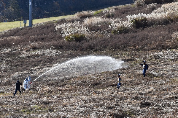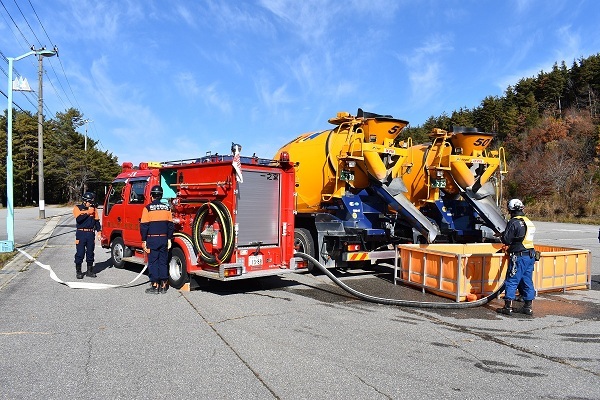 16日(日曜日)は、高山市において、緊急消防援助隊中部ブロック合同訓練を視察し、地元高山市消防団が林野火災を想定して、ミキサー車から給水した簡易水槽を水利とした長距離送水訓練を実施する様子を見学しました。消防団活動の参考となる、非常に有意義な訓練内容でした。