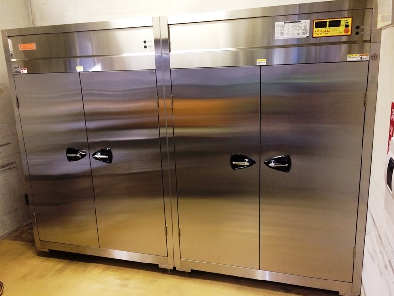 消毒保管庫:学校や病院、事業所給食等の厨房で使用される、洗浄後の食器類を熱風で消毒・乾燥し、そのまま次の使用時まで保管するための機器です。洗浄後に、濡れた状態のまま給食室内に食器や調理器具を放置していると、空気中の細菌が再付着し、感染の恐れがあります。本機を使用することで、これまで以上に安全・安心な給食を提供することができます。