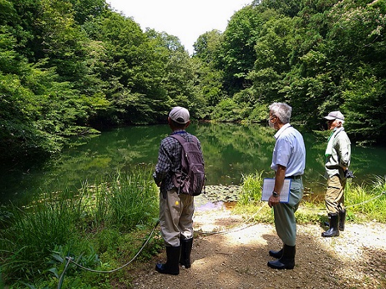 モリアオガエルの卵塊だけでなく、水面近くを乱舞するルリイトトンボ、可憐に咲くヒツジグサなど、様々な動植物に出会いました。