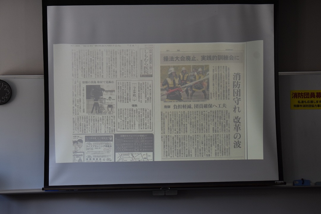 15日(土曜日)は、飛騨市消防本部において、地元飛騨市消防団が改革を進めている「NEO(新しい)飛騨市消防団」について説明を受けました。