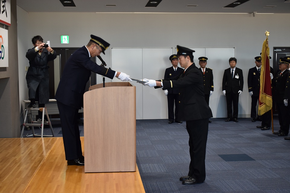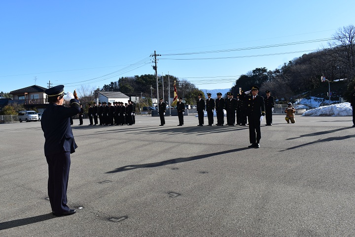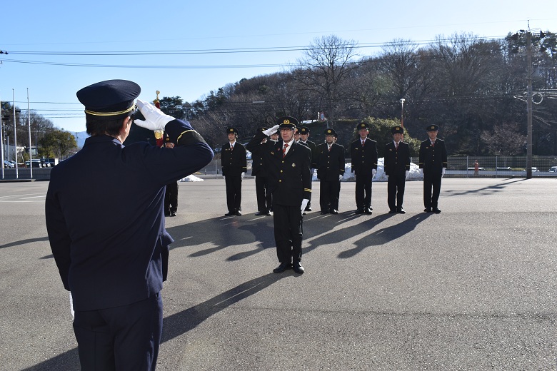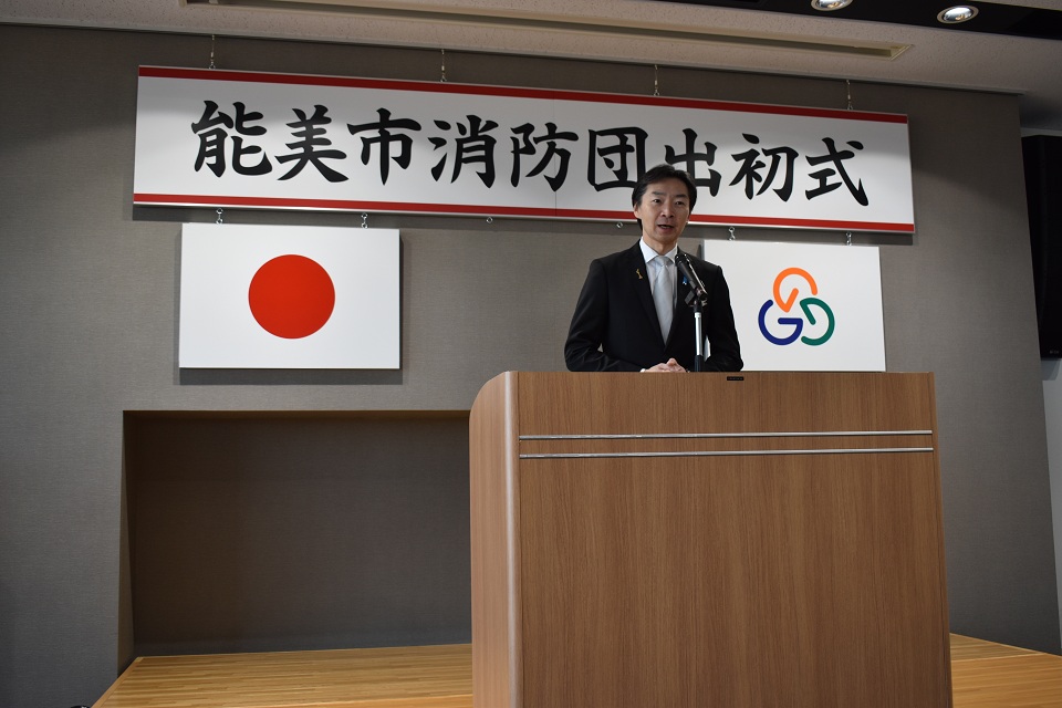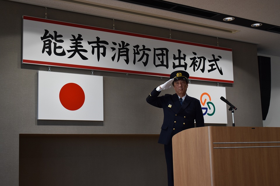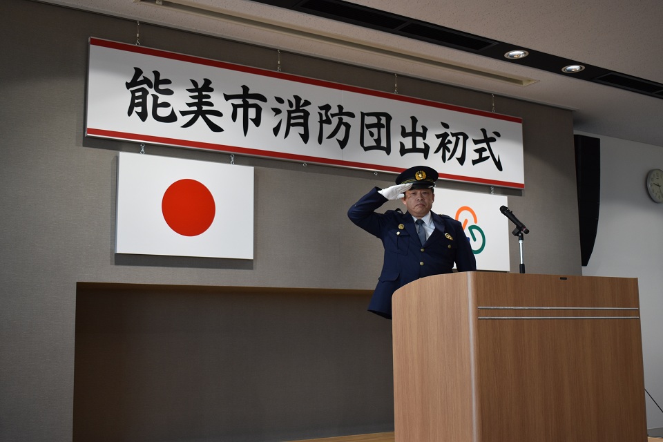 令和8年1月10日(土曜日)、本年が火災・災害のない一年になることを願い、「能美市消防団出初式」が能美市防災センターで開催されました。式典後には防災センター駐車場において、服務規律点検と初放水も行われ、団員らは消防団員としての士気高揚と職務遂行の決意を新たにしました。