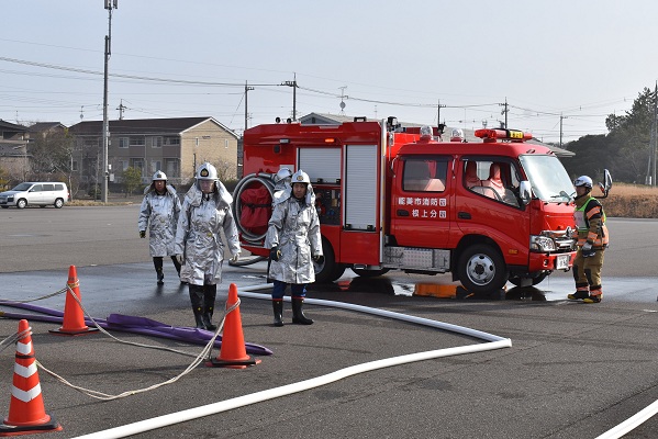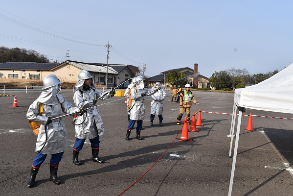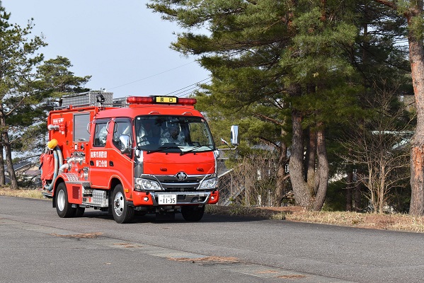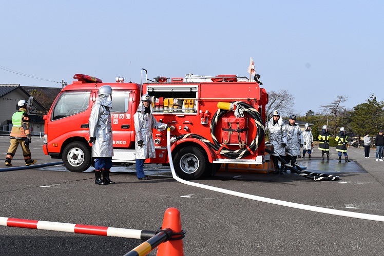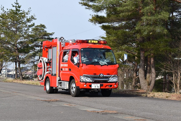 能美市消防団は住宅密集地における火災防ぎょ、ジェットシューターを使用した飛火警戒、住民への広報巡回及び転戦活動を実施し、手順の確認を行いました。