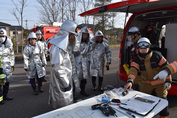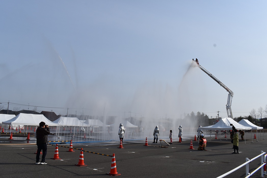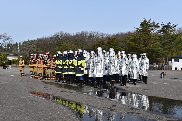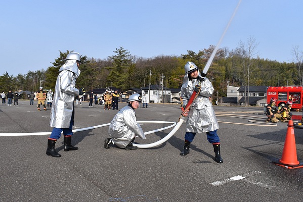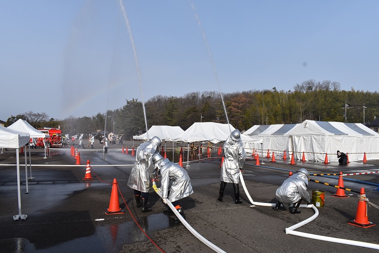 令和8年3月22日(日曜日)、能美市泉台町 九谷陶芸村駐車場において春季火災防ぎょ訓練が実施されました。訓練は火災注意報発令中に住宅密集地で建物火災が発生、強風下により火の粉が周辺住宅へと飛散したと想定し、出火建物周囲の防ぎょに加え、転戦、防災ヘリコプターにて状況把握及び空中消火を実施し、延焼防止を図ることを目的として行われました。
